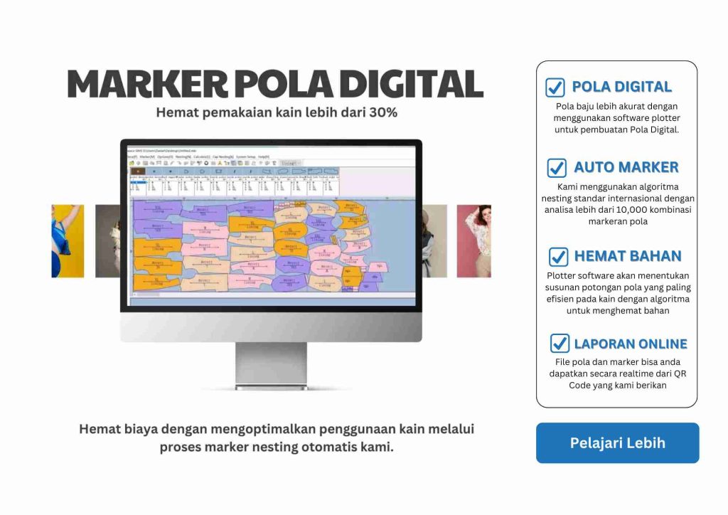 Anda bisa mendapatkan Pola Digital mulai dari Rp100,000 saja. Semua pola kami juga sudah termasuk markeran bahan menggunakan agoritma nesting teknologi terkini dengan menganalisa lebih dari 10,000 variasi markeran susunan pola.